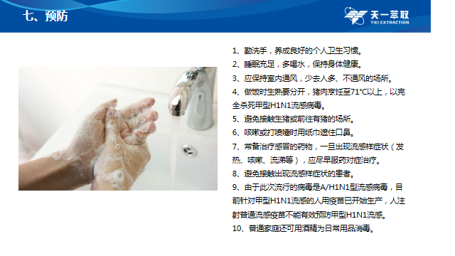 流行性感冒(简称流感)是流感病毒引起的急性呼吸道感染,也是一种传染性强、传播速度快的疾病。其主要通过空气中的飞沫、人与人之间的接触或与被污染物品的接触传播。典型的临床症状是:急起高热、全身疼痛、显著乏力和轻度呼吸道症状。针对流感特征,日常预防是关键。天一萃取为大家总结了几点预防方法,祝愿大家可以健健康康迎接新年!